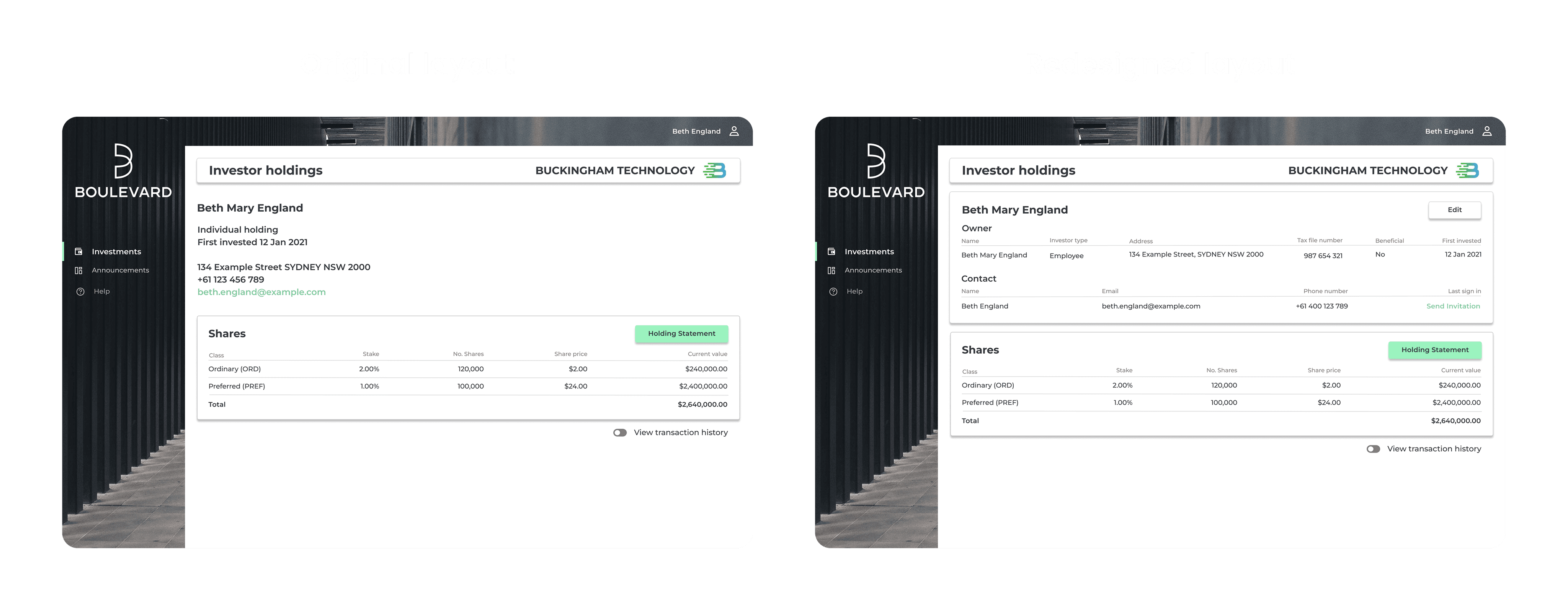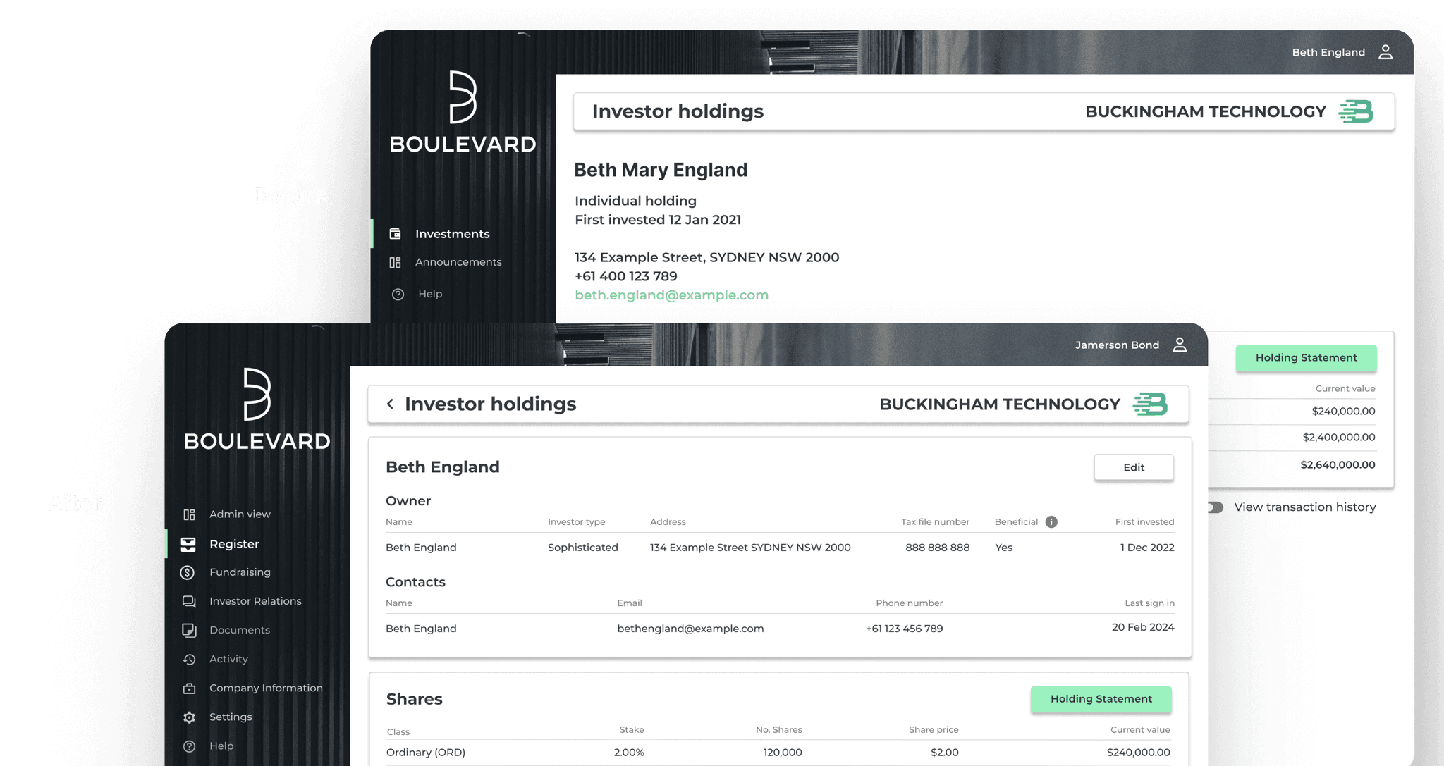 Investor profile system for a fintech share registry platform previously Boulevard now rebranded as Liquidise. The platform helps private companies manage shareholder data, issue equity, and stay compliant with ASIC regulations.